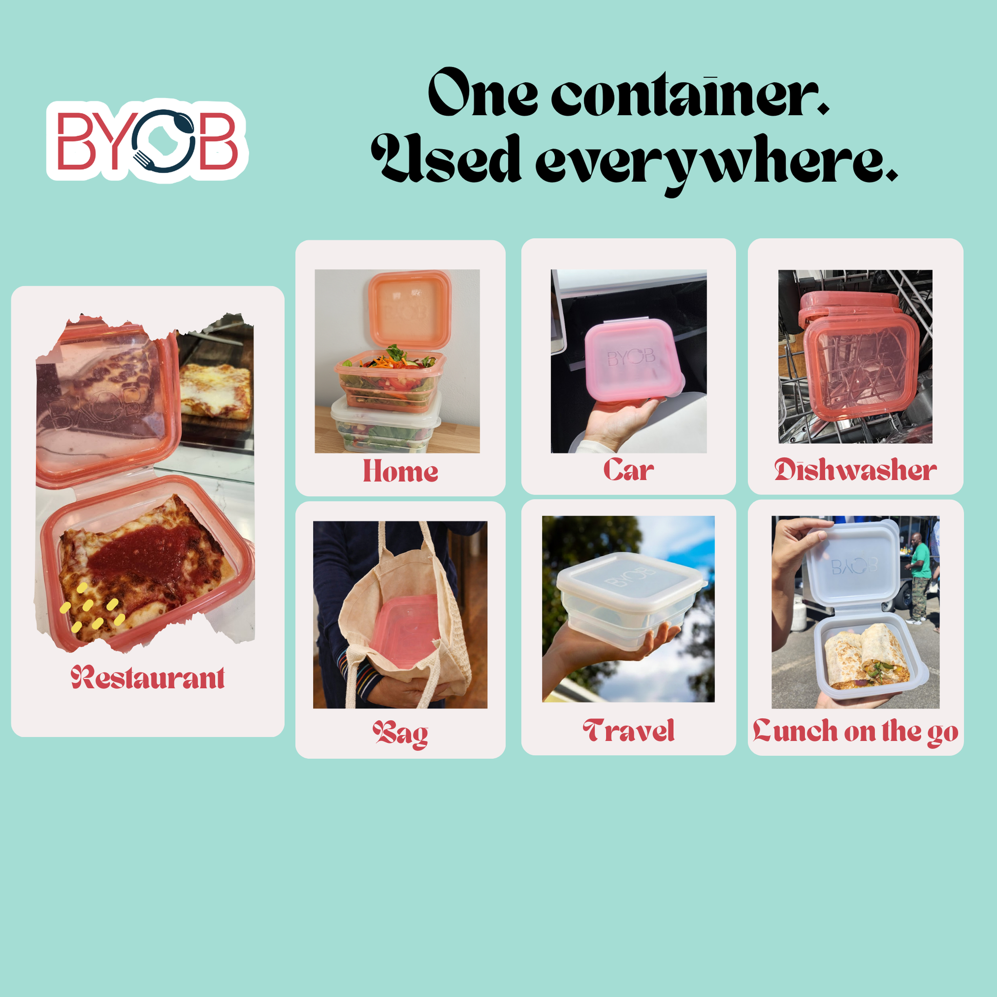 Every time we get takeout food, it usually comes in a plastic box that gets thrown away after one use. BYOB is different - it’s a reusable container that you can wash and bring back again and again. By using one BYOB instead of hundreds of throwaway boxes, we keep a lot of plastic out of the trash and help protect the Earth.