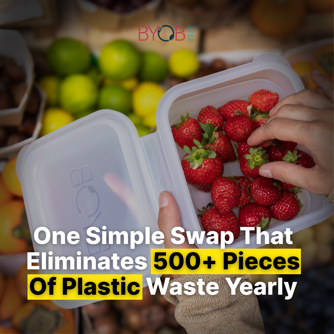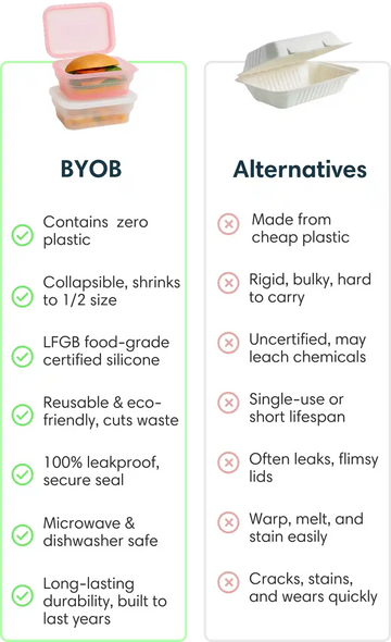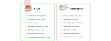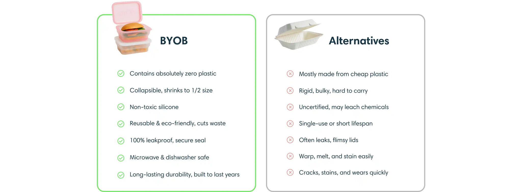 Every time we get takeout food, it usually comes in a plastic box that gets thrown away after one use. BYOB is different - it’s a reusable container that you can wash and bring back again and again. By using one BYOB instead of hundreds of throwaway boxes, we keep a lot of plastic out of the trash and help protect the Earth.