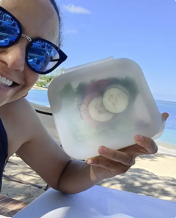 Sleek 34oz premium silicone container. Collapses to one-half, attached lid, withstands extreme temps from freezer to oven waste-free.